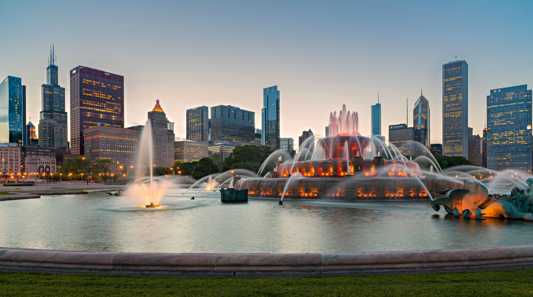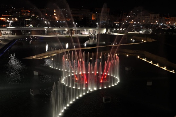 A musical fountain creates a captivating visual and aural experience by synchronizing water movements with music.